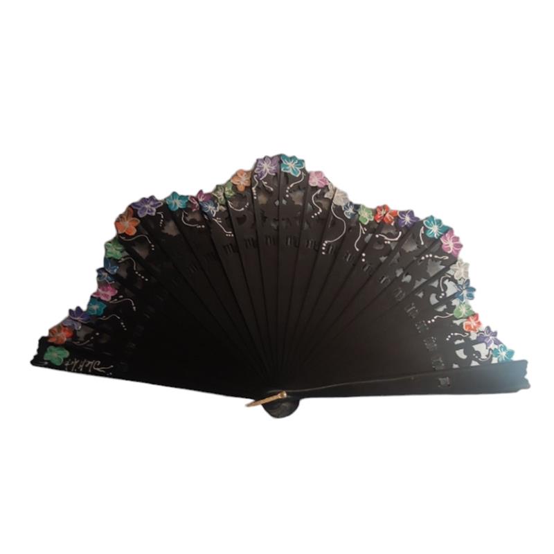 • ABANICO baraja con calado, color negro, dibujo de flor en tono rosa y malva, madera de arce lacado, tamaño medio
