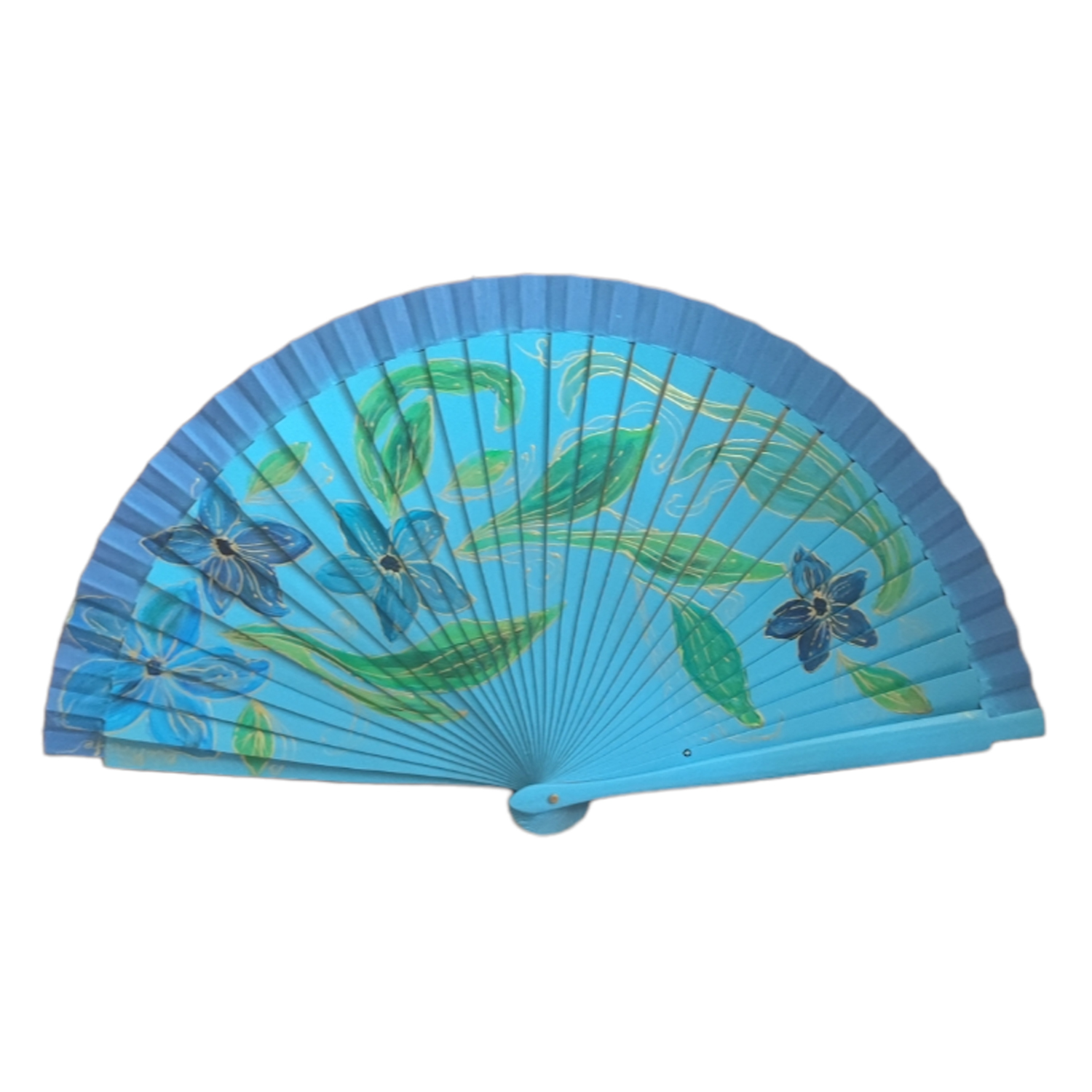 • ABANICO clásico, color azul turquesa, dibujo de hojas y flores, madera de arce lacado, tamaño medio