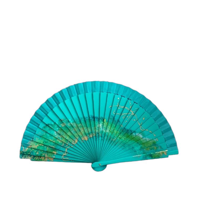 • ABANICO de bolsillo, color verde, dibujo abstracto, madera de arce lacada, tamaño pequeño