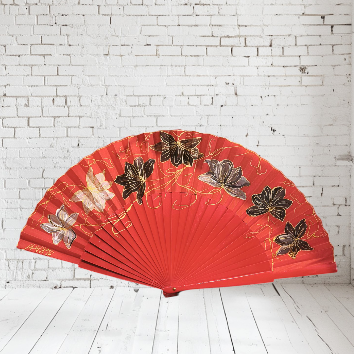 • ABANICO semipericón, color rojo, dibujo de flor blanca y negra, en madera lacada , tamaño grande