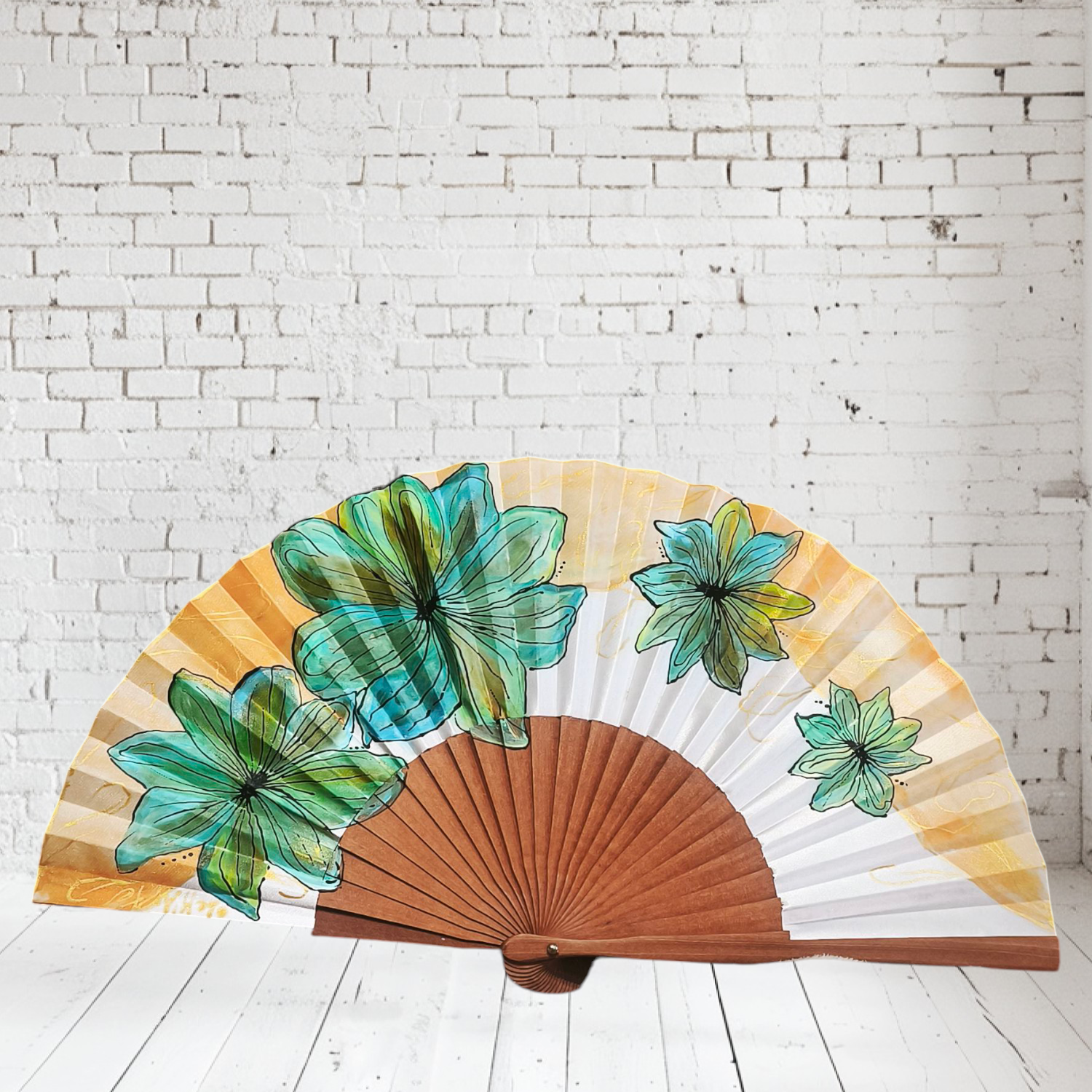 Abanico pintado a mano  en madera de peral y país de seda, ideal para el verano por su ligereza, único y exclusivo. Totalmente personalizado.