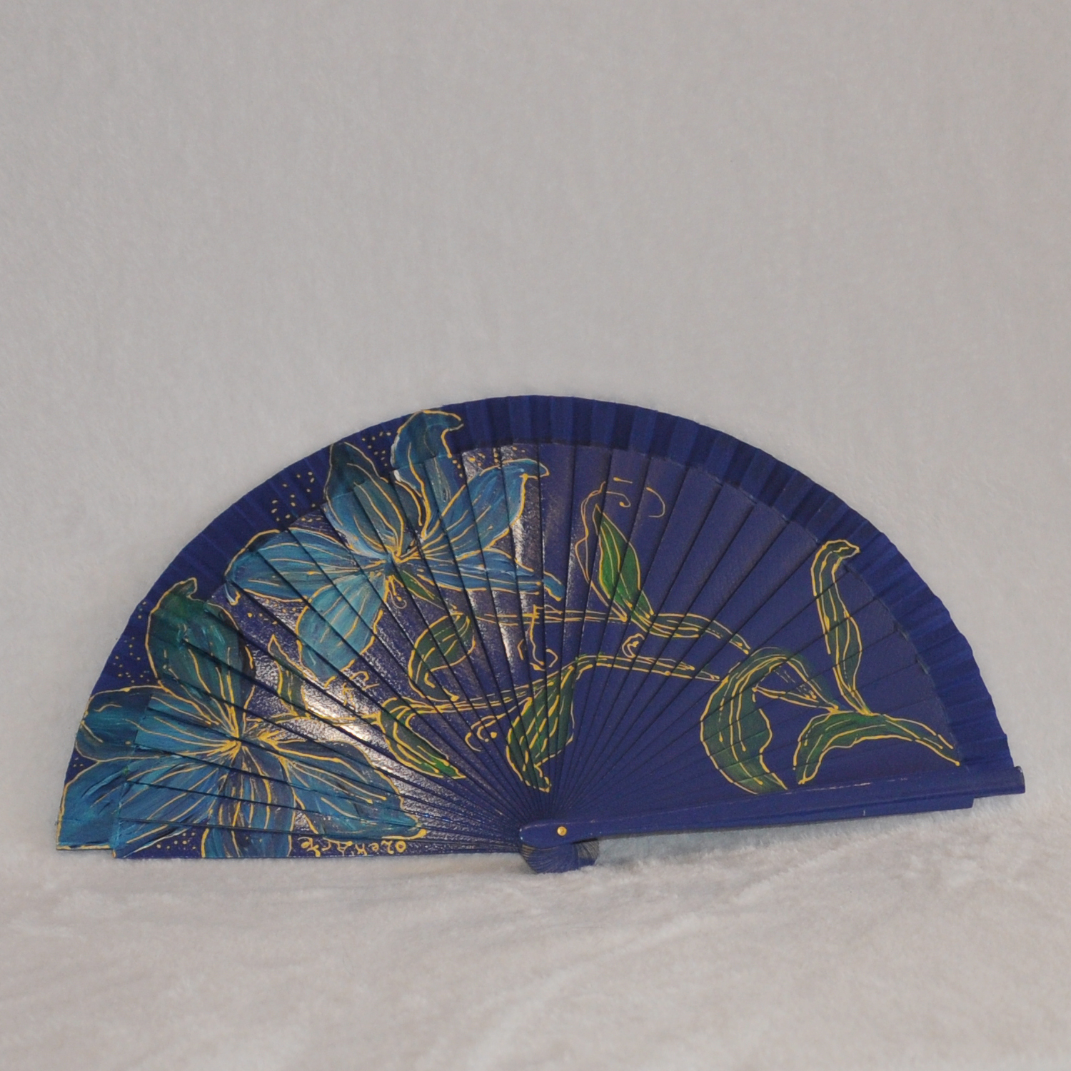 Abanico realizado en madera de Arce lacado, pintado a mano alzada por las dos caras, ligero y practico de uso diario. Tamaño clásico 23 cm