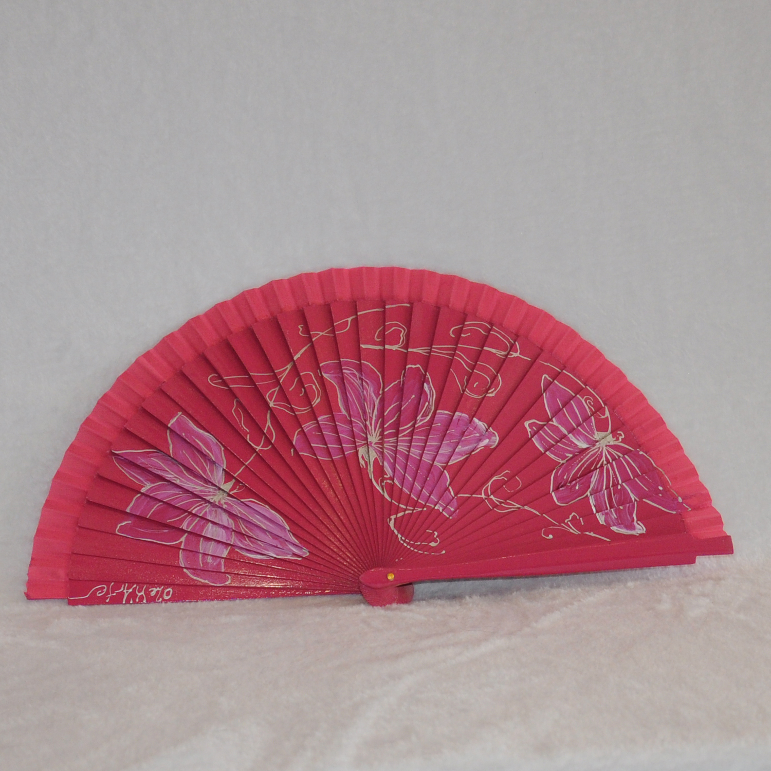 Abanico realizado en madera de Arce lacado, pintado a mano alzada por las dos caras, ligero y practico de uso diario. Tamaño clásico 23 cm