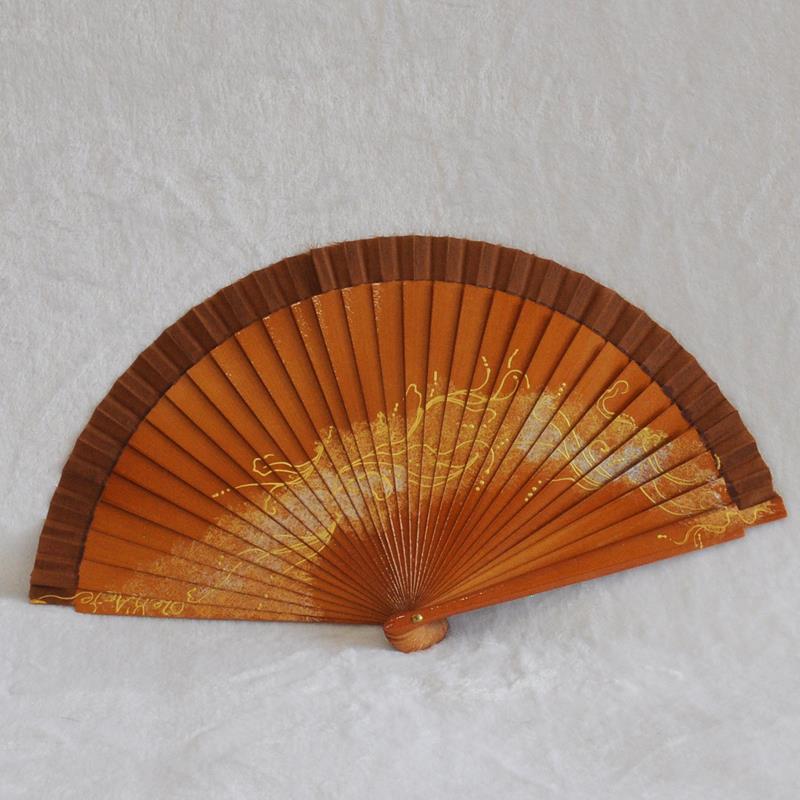 • ABANICO clásico, color madera avellana, dibujo de espirales doradas, madera de arce lacado, tamaño medio
