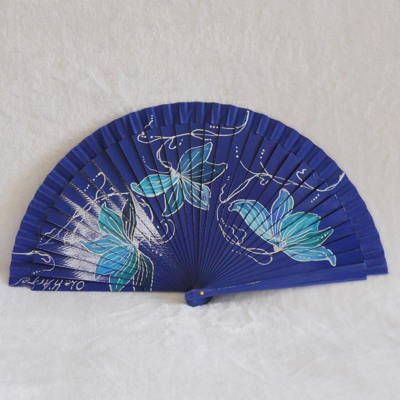 • ABANICO clásico, color azul tinta, dibujo de flores azules, madera de arce lacado, tamaño medio