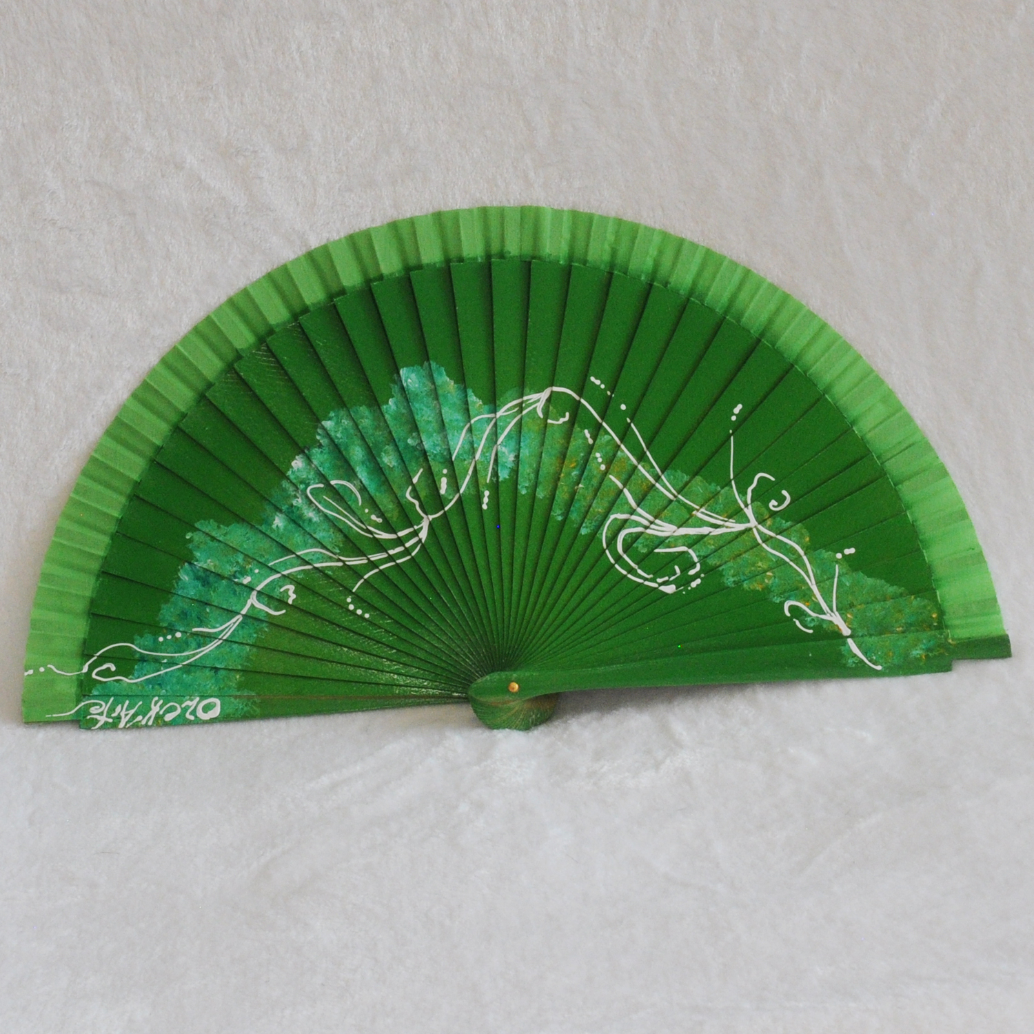 • ABANICO clásico, color verde, dibujo de espirales, madera de arce lacado, tamaño medio