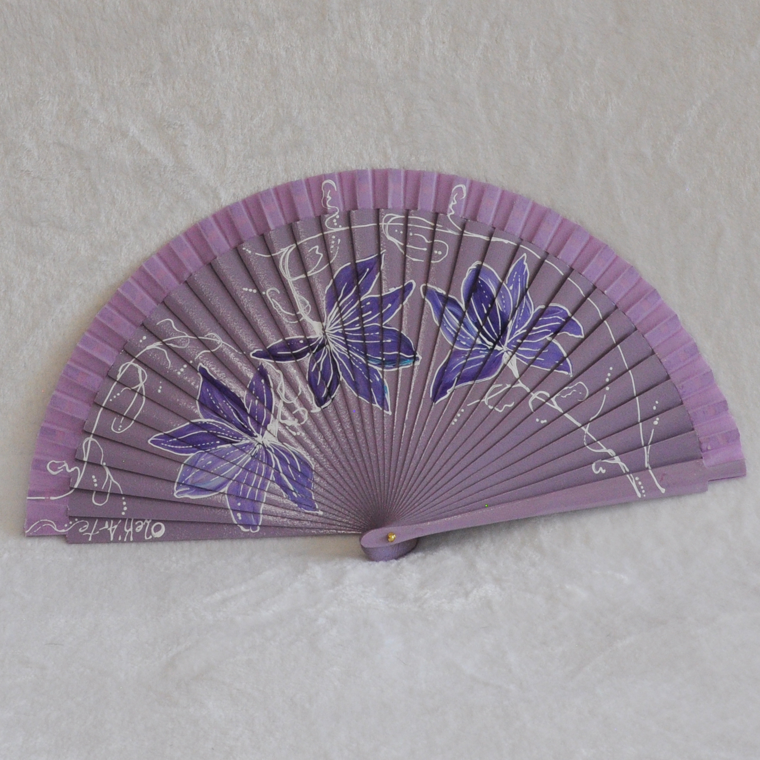 • ABANICO clásico, color malva, dibujo de flores, madera de arce lacado, tamaño medio