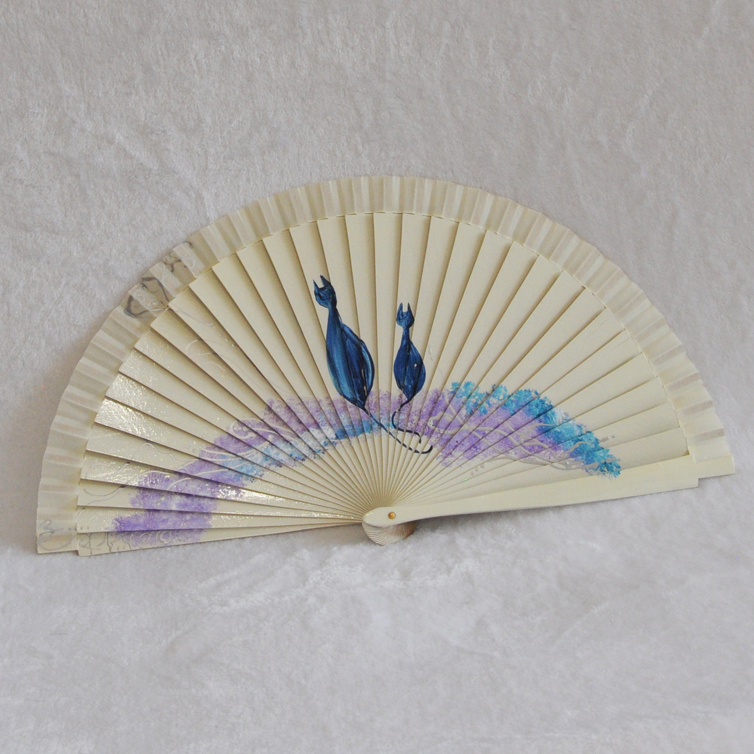 • ABANICO clásico, color blanco, dibujo de gatos, madera de arce lacado, tamaño medio