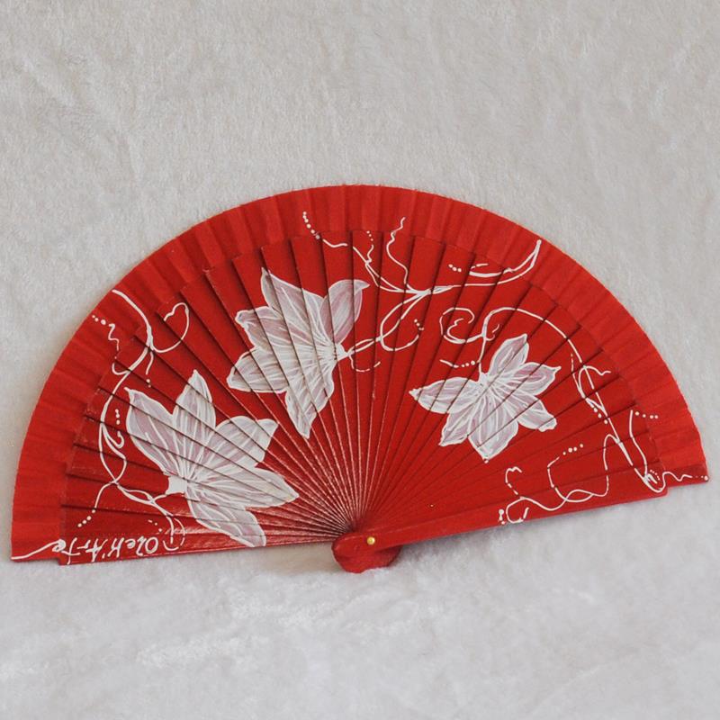 • ABANICO de bolsillo, color rojo, dibujo de flores blancas, madera de arce lacada, tamaño pequeño