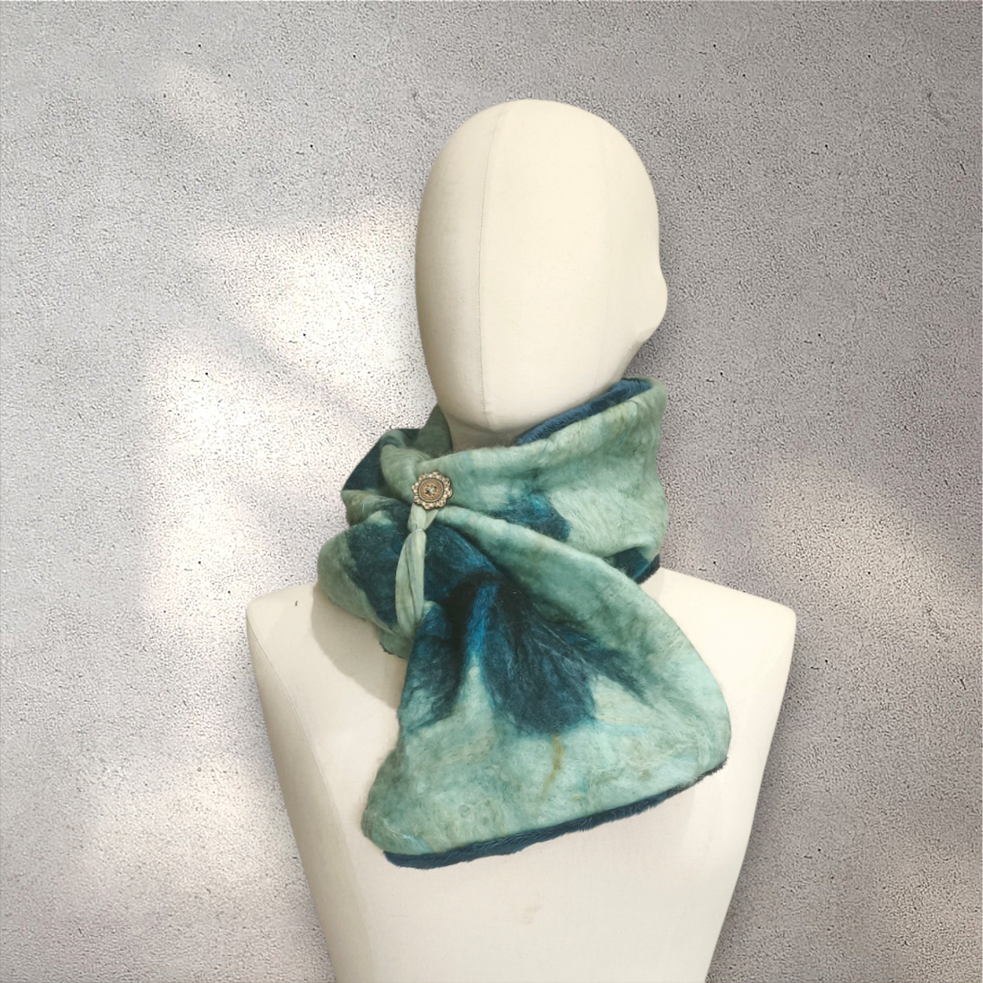 • CUELLO, en azul agua, con diseño de flor en lana merino afieltrada, interior de modal tèrmico, para evitar alergias.