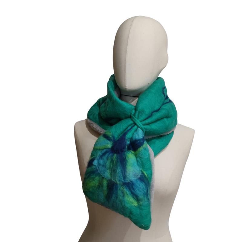 Cuello realizado en lana merino de 19 micras, afieltrado a mano. Forrado con modal térmico, muy agradable y de gran suavidad en contacto con la piel.