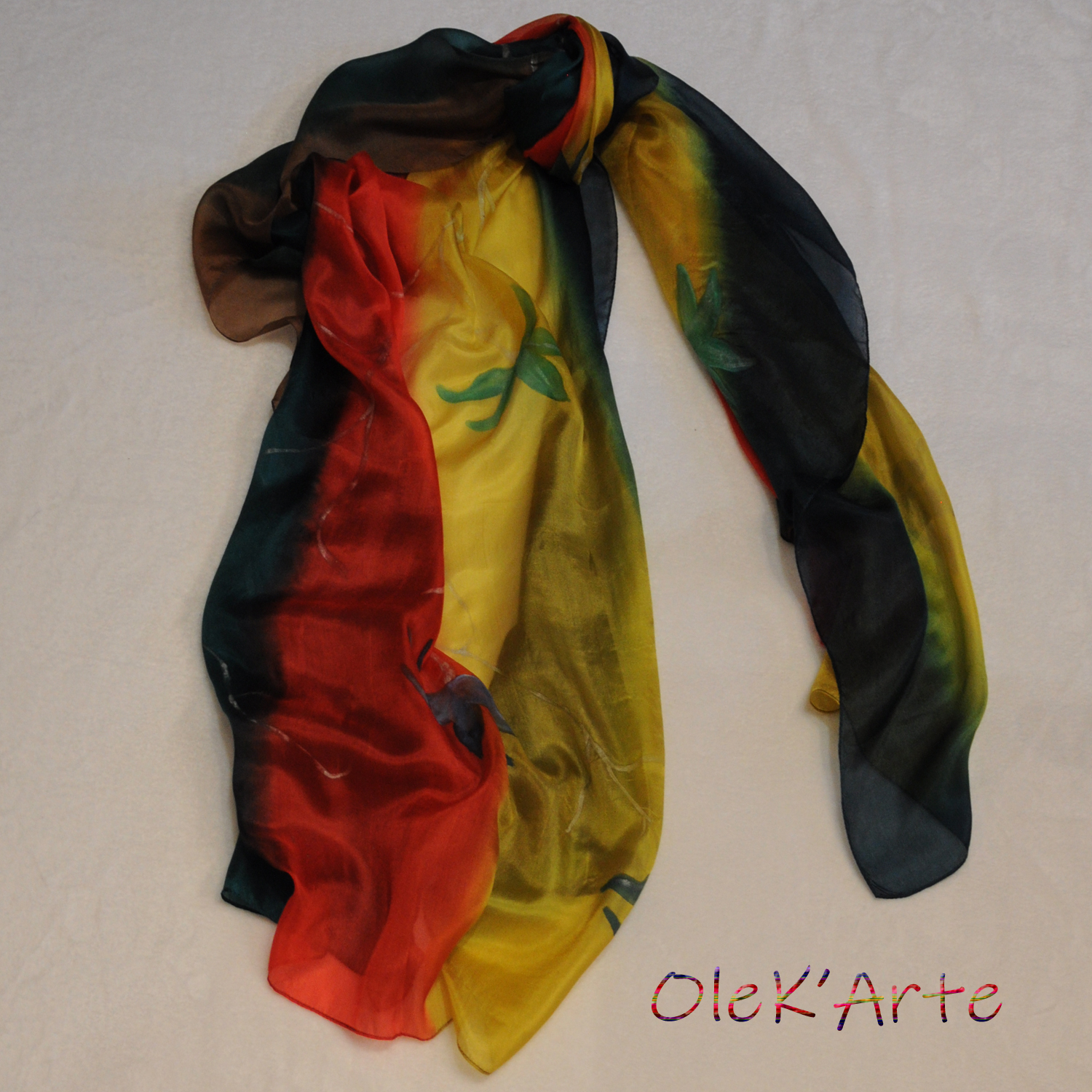 Fular en seda satin, pintado a mano alzada, material ligero y agradable. Gramaje medio Muy combinable Se recomienda lavar a mano en agua fria