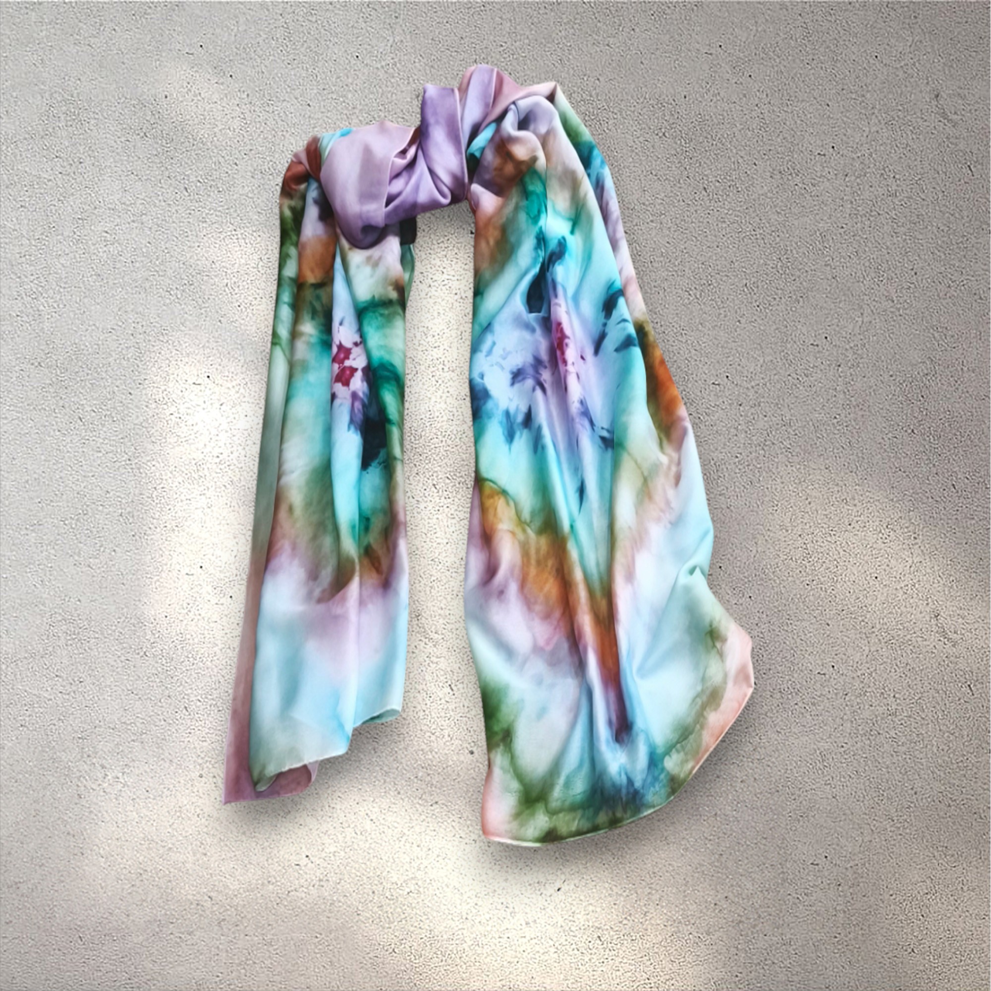 Fular en seda satén, pintado a mano alzada técnica de shibory, material ligero y agradable. Gramaje medio Muy combinable