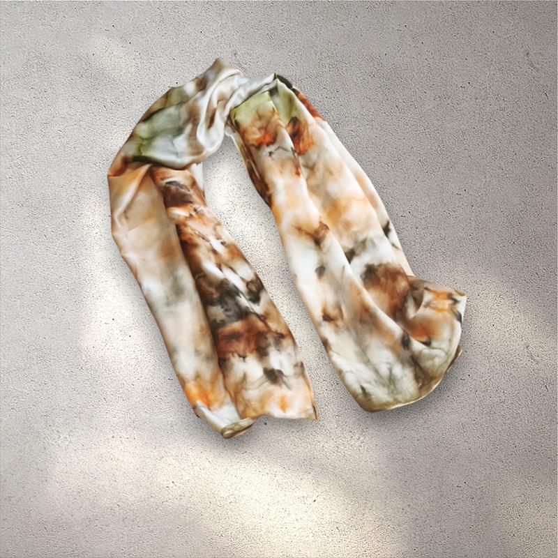 Fular en seda satén, pintado a mano alzada técnica de shibory, material ligero y agradable. Gramaje medio Muy combinable