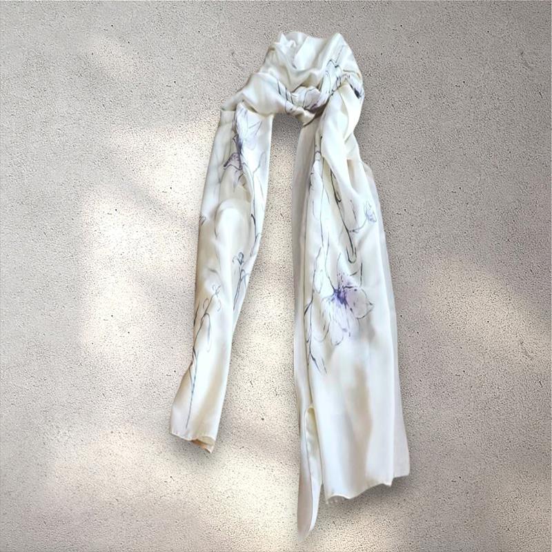 Fular en seda satin, pintado a mano alzada, material ligero y agradable. Gramaje medio Muy combinable Se recomienda lavar a mano en agua fria