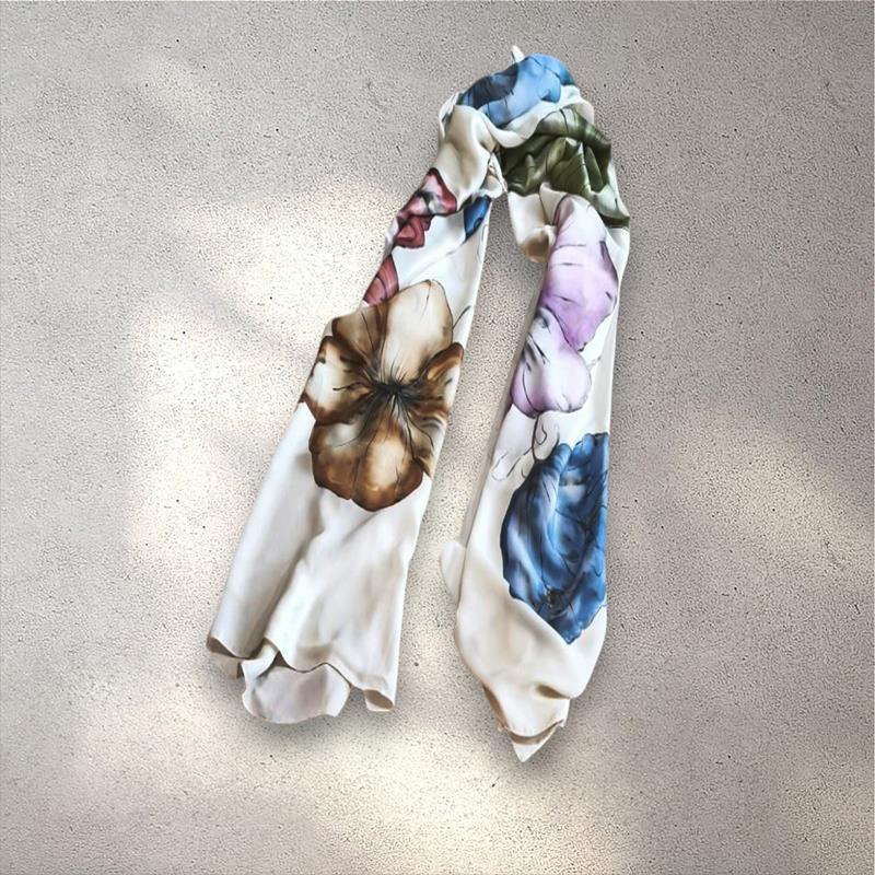 Fular en seda satin, pintado a mano alzada, material ligero y agradable. Gramaje medio Muy combinable Se recomienda lavar a mano en agua fria