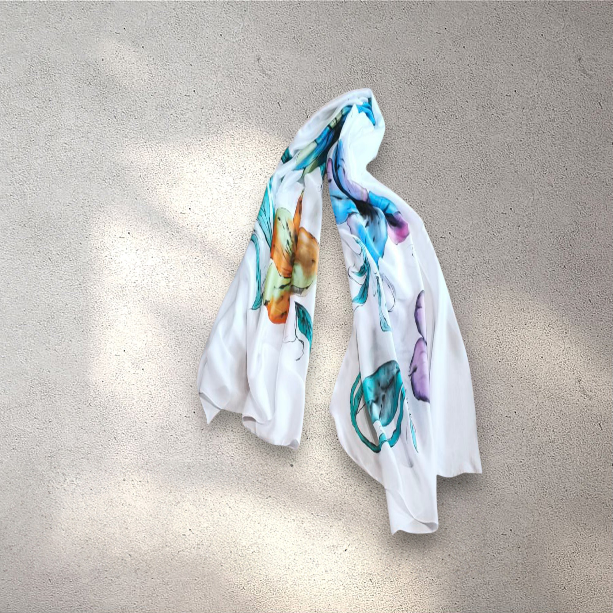 Fular en seda satin, pintado a mano alzada, material ligero y agradable. Gramaje medio Muy combinable Se recomienda lavar a mano en agua fria