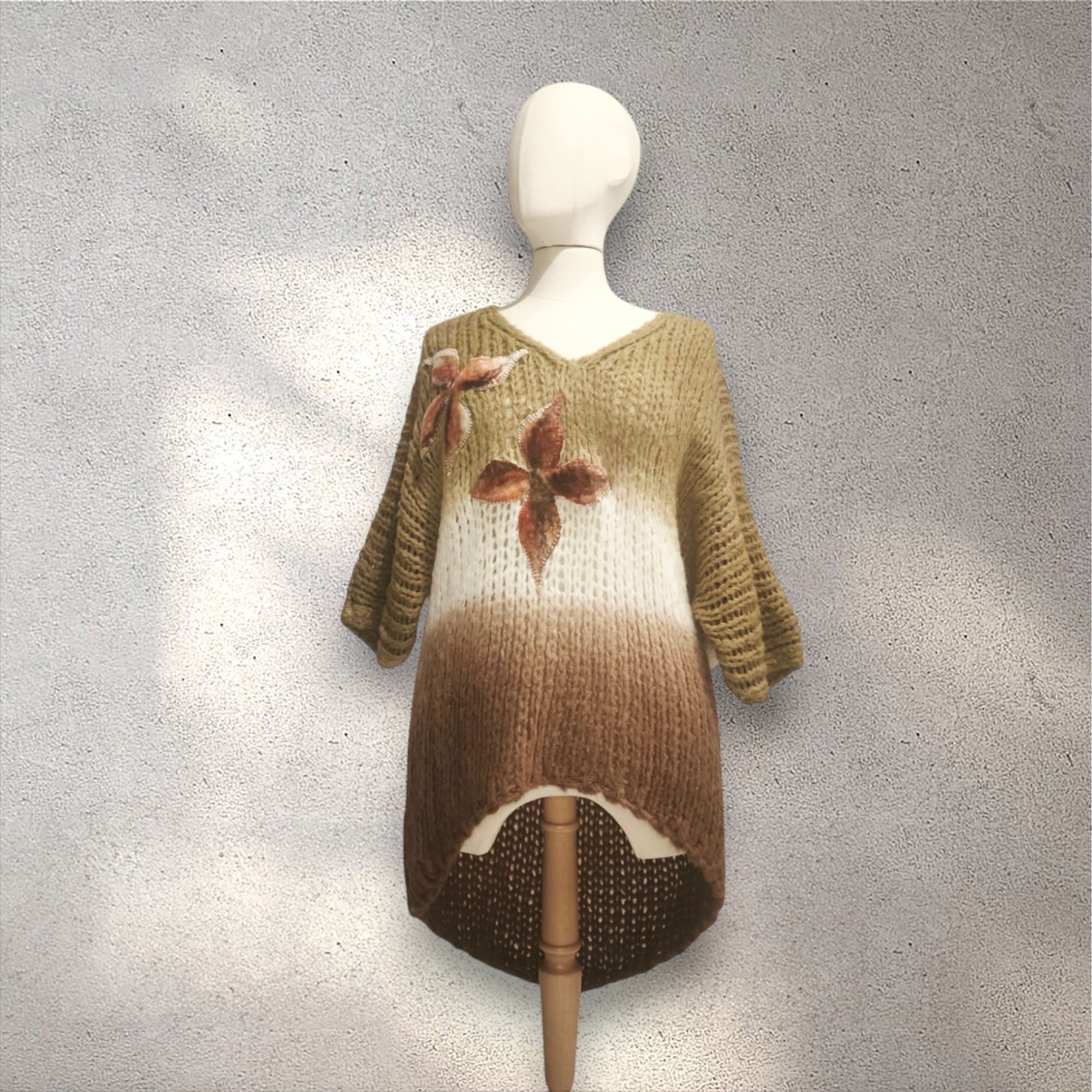 Prenda oversize cuello pico manga francesa con aplicación de mariposas en lana merina bordada, te sentirás única y elegante como nuestras prendas. Nuestro trabajo es artesanal y sostenible, no hay dos iguales