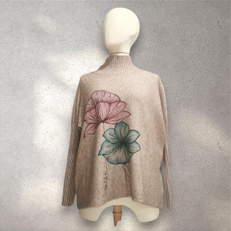 Precioso y cálido jersey de tacto muy suave, cuello barco vuelto, cuerpo ajustado, aplicación bordada. No hay dos iguales