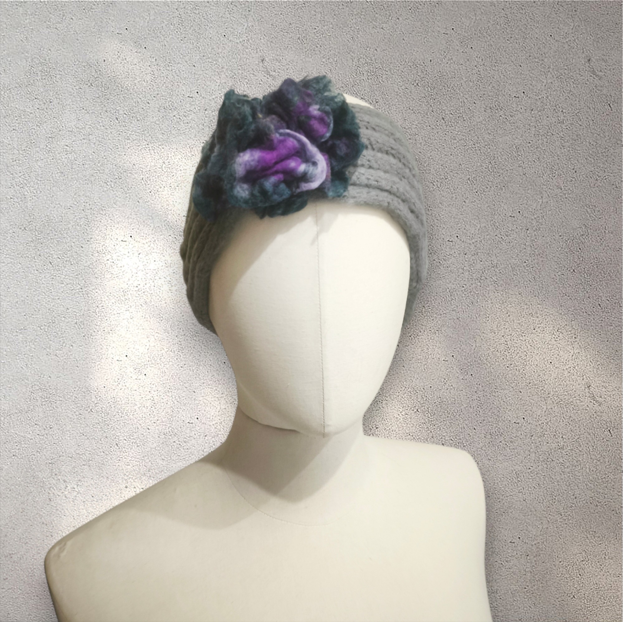 • TURBANTE tipo cinta de color gris agua con flor azul de lana fieltro