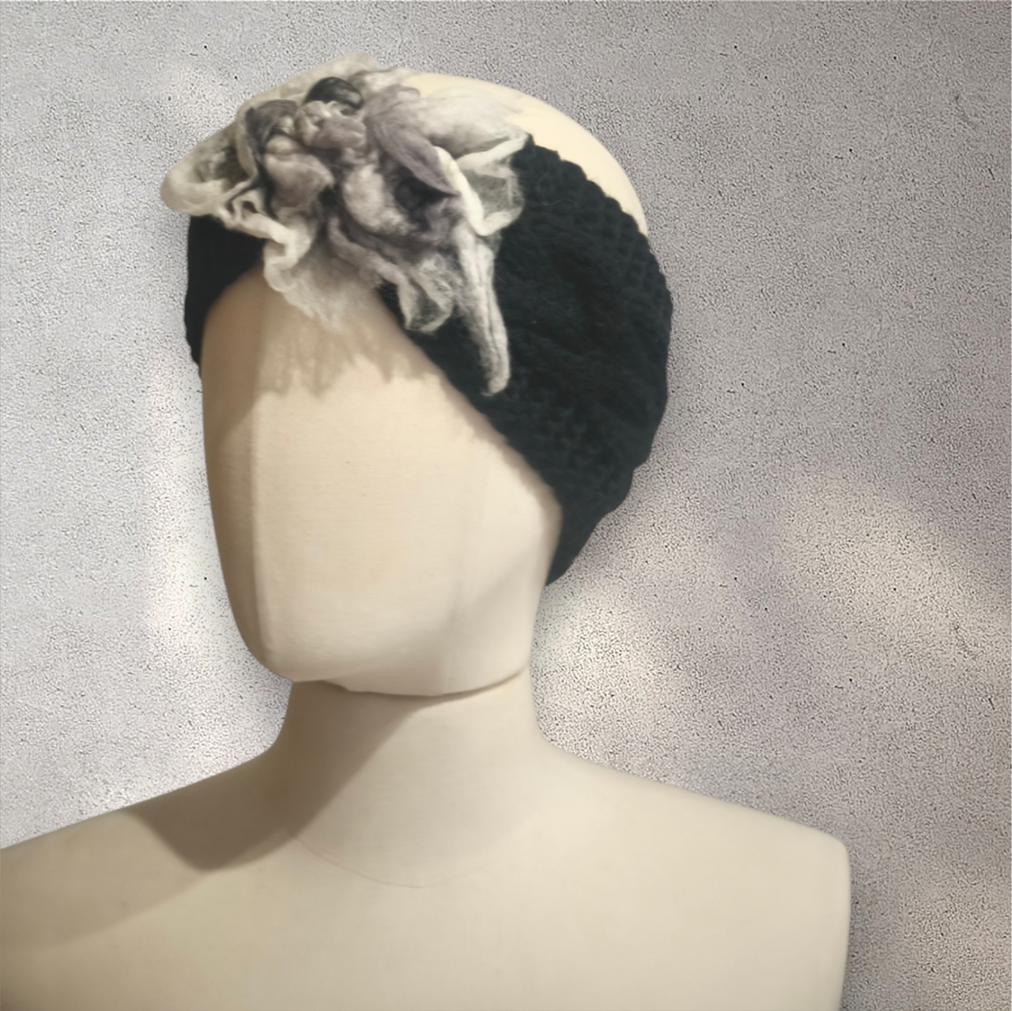 • TURBANTE tipo cinta de color negro con flor gris de lana fieltro